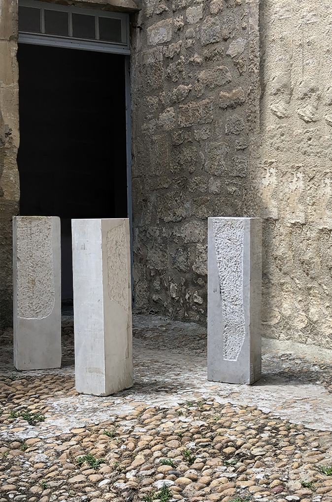Les trois blocs sont prêts à être assemblés pour former un nouvel élément architectural… ou non… On est dans un moment d’incertitude, de tâtonnement de l’artiste où tout peut intervenir : déplacement, séparation, union…